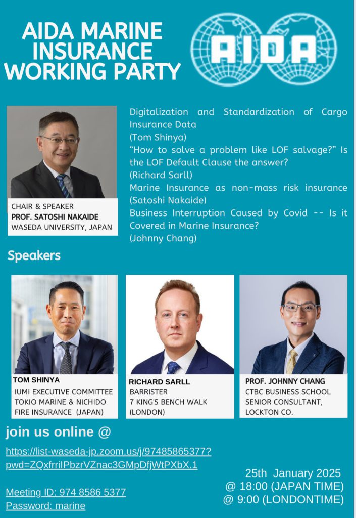 本中心張冠群執行長於2025年1月25日受邀擔任國際保險法學會(AIDA) 海上保險研究工作會(Marine Insurance Working Party)年度例會的演講人,與來自日本及英國的演講人同場針對海上保險及商業財產保險最新實務議題進行研討交流。本次會議採線上與實體雙軌方式進行,張冠群執行長以實體方式於東京進行演講。
